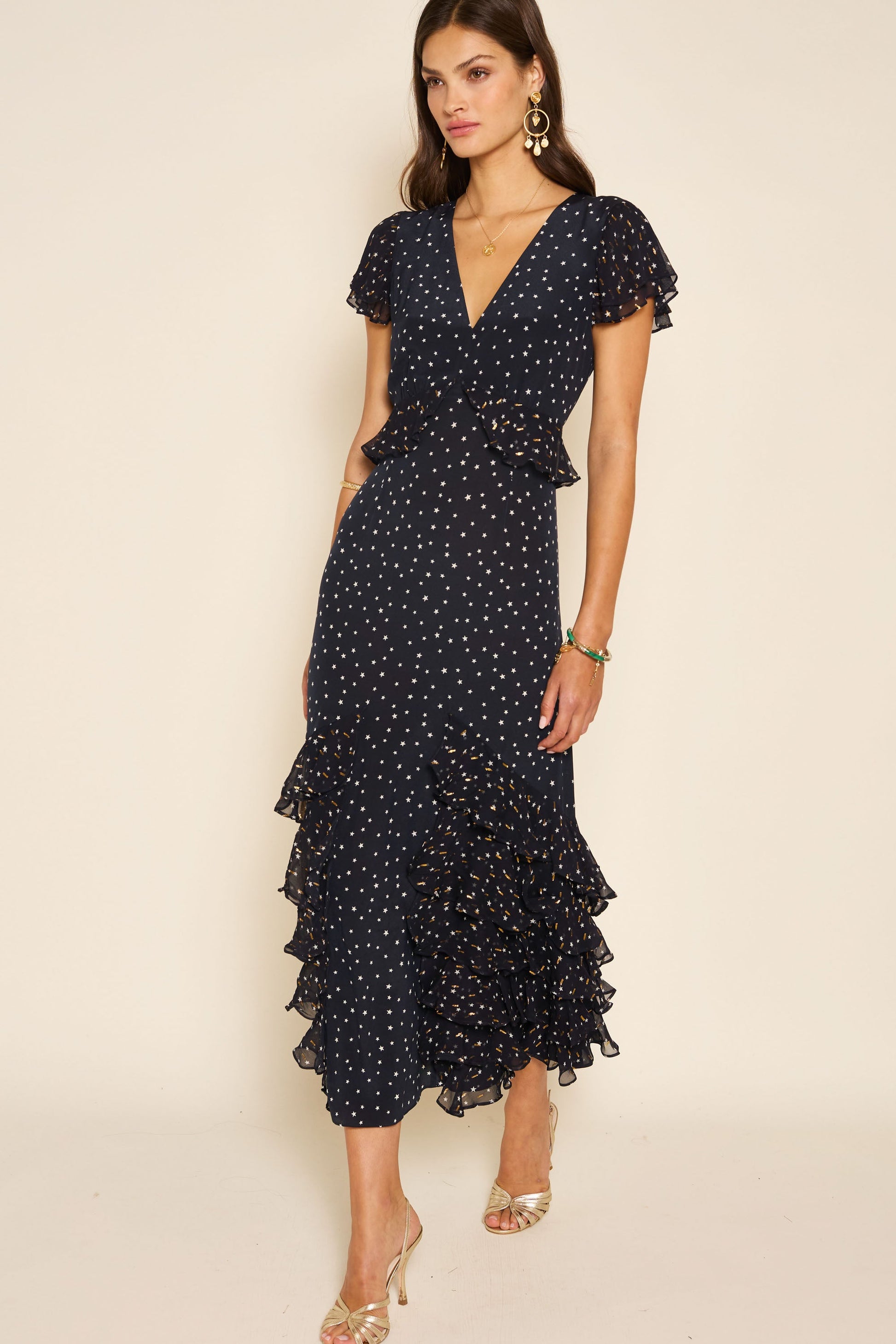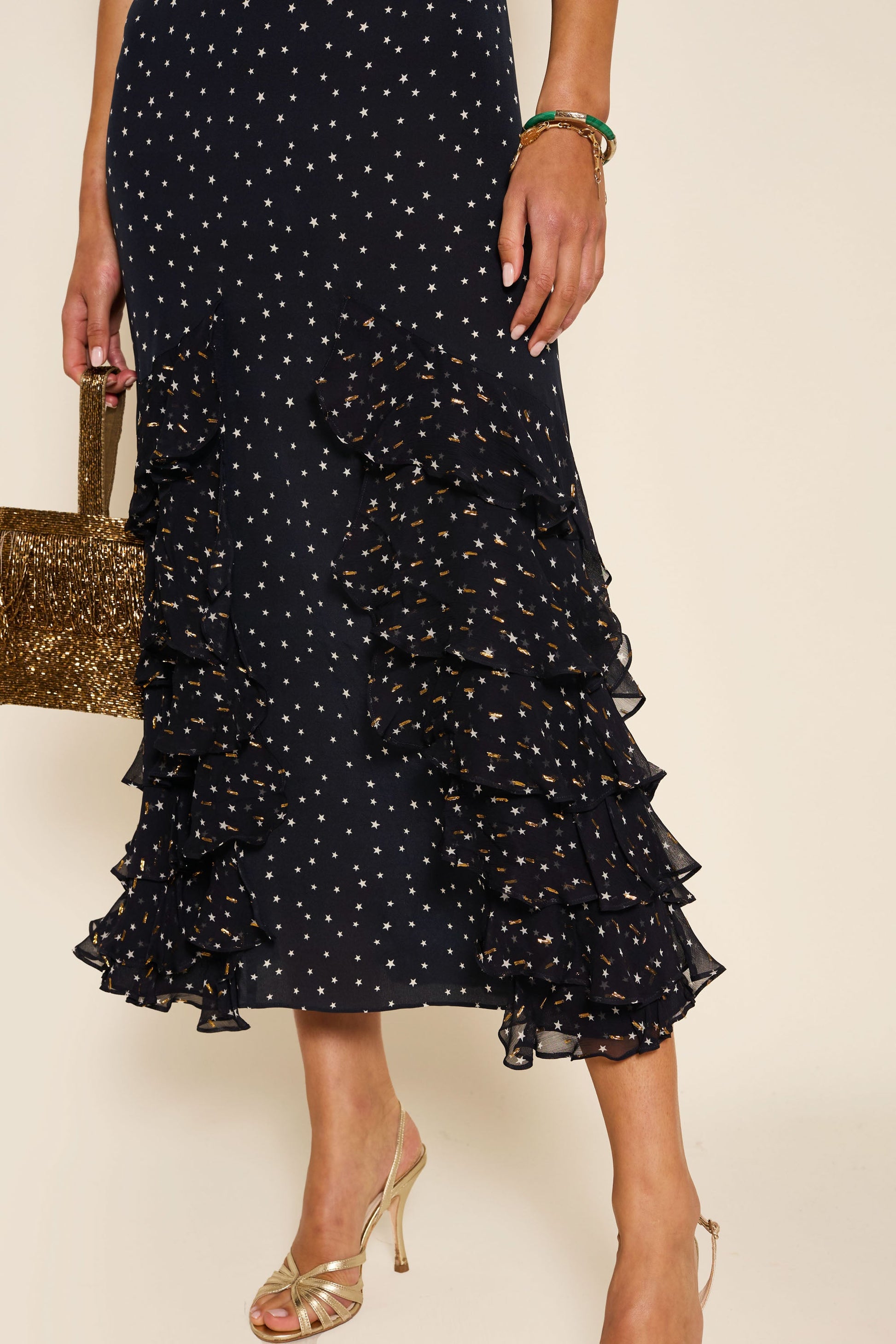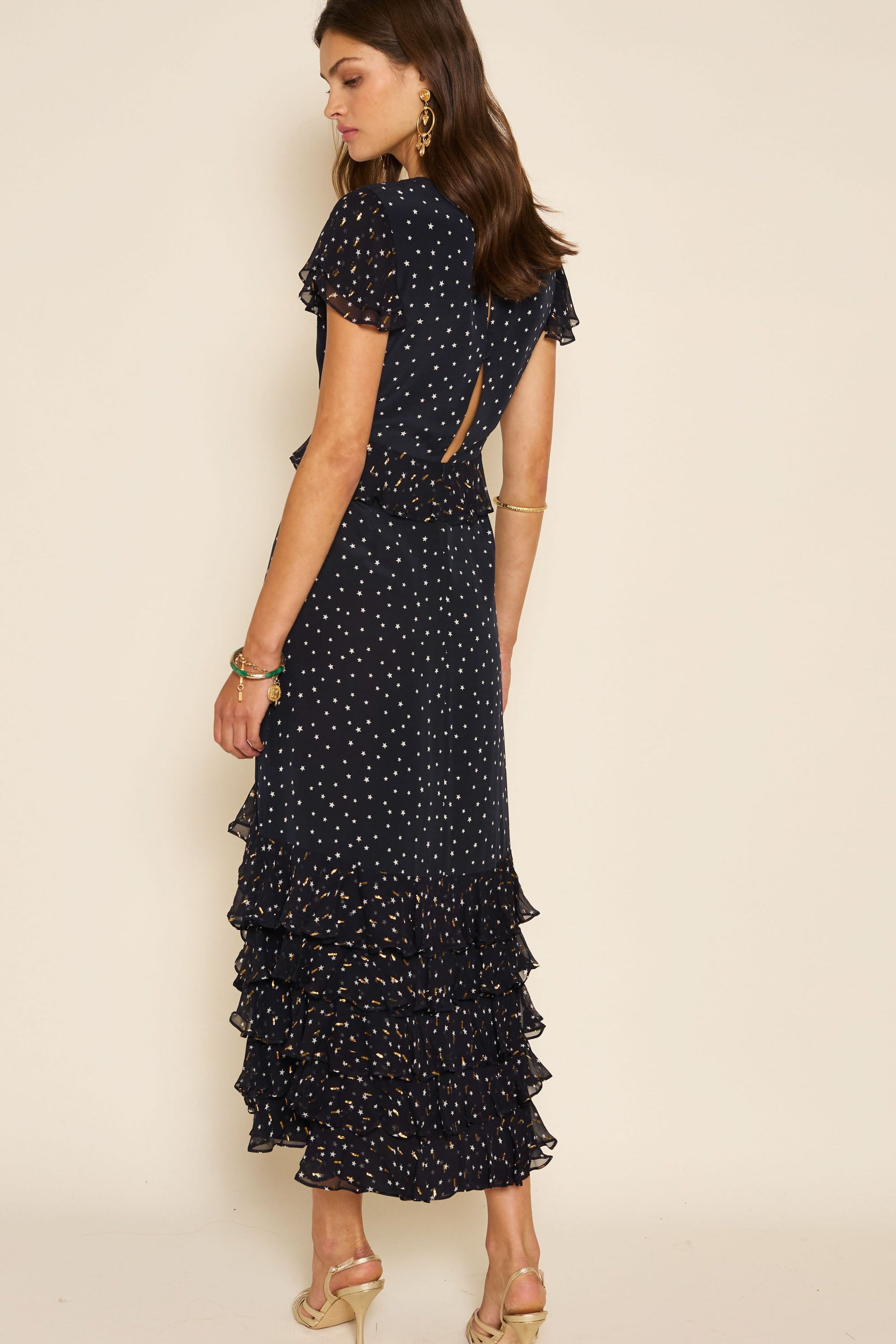 This Thanvi dress is a bestselling shape, updated in our new vintage-inspired Starry Night print. It's slit at the back and layered with georgette ruffles that are flecked with gold to shimmer like the night sky.