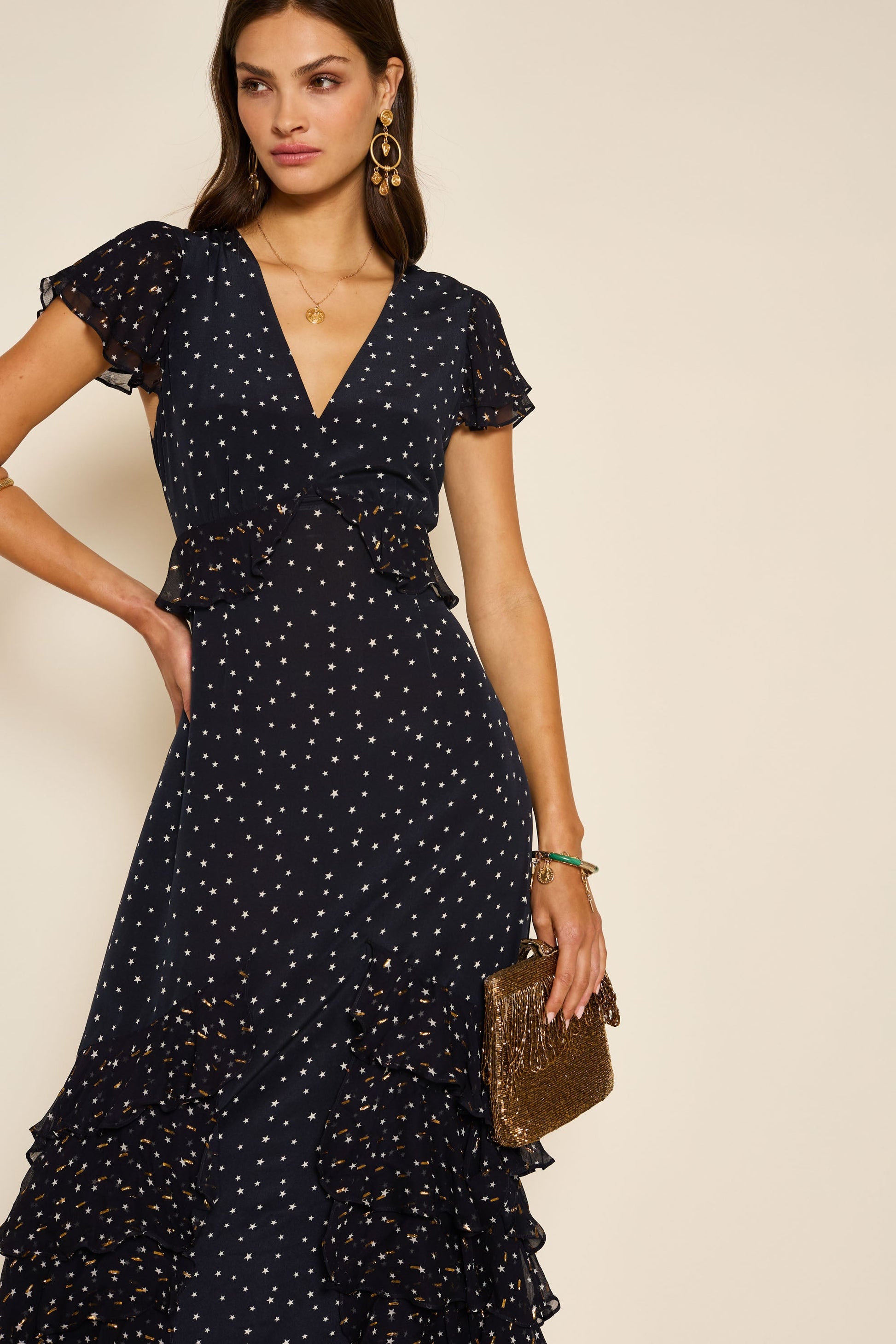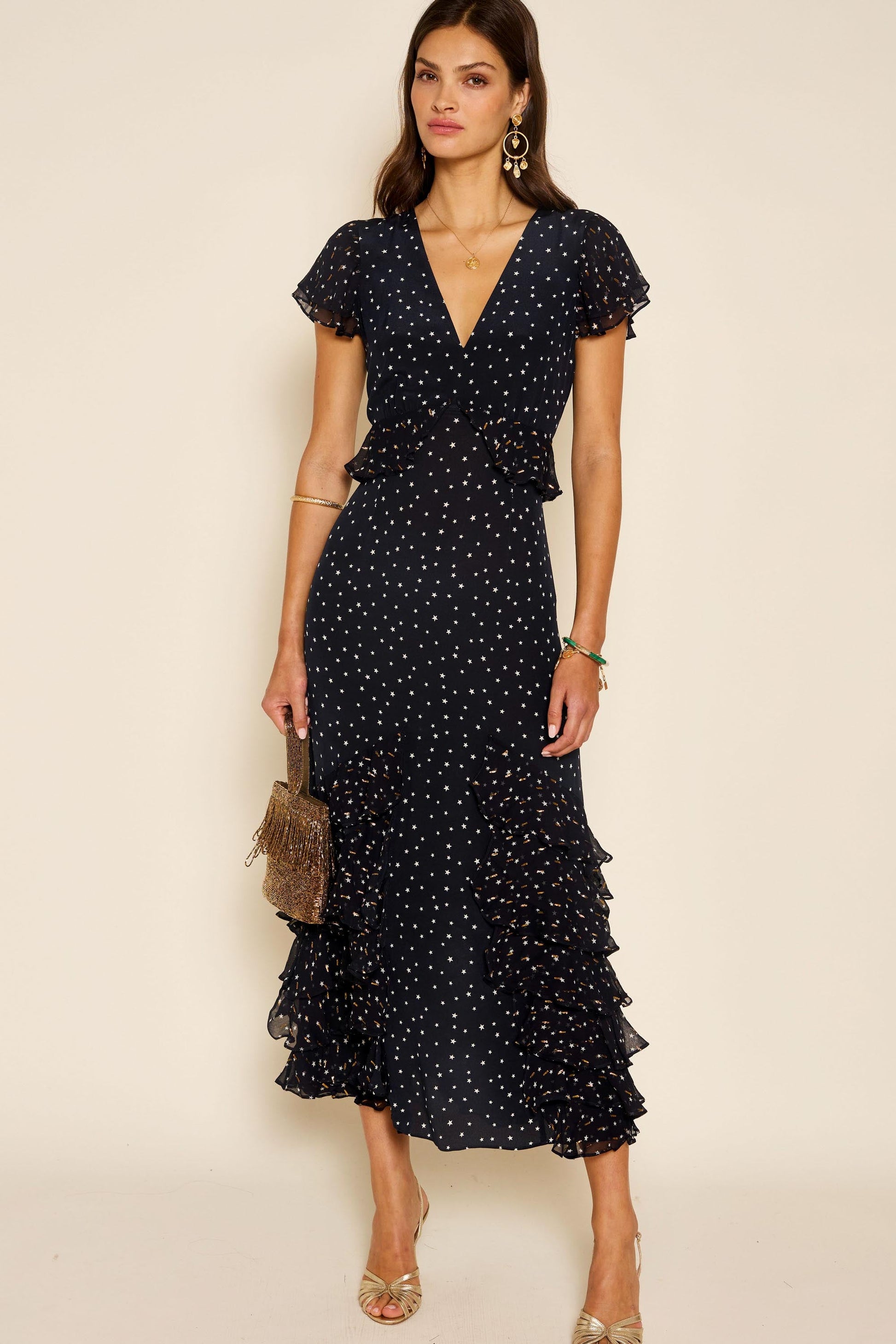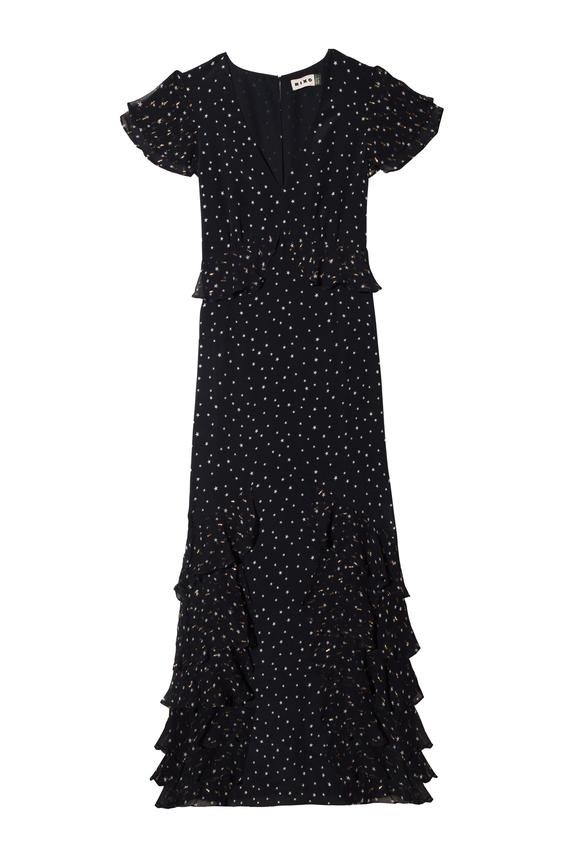 This Thanvi dress is a bestselling shape, updated in our new vintage-inspired Starry Night print. It's slit at the back and layered with georgette ruffles that are flecked with gold to shimmer like the night sky.