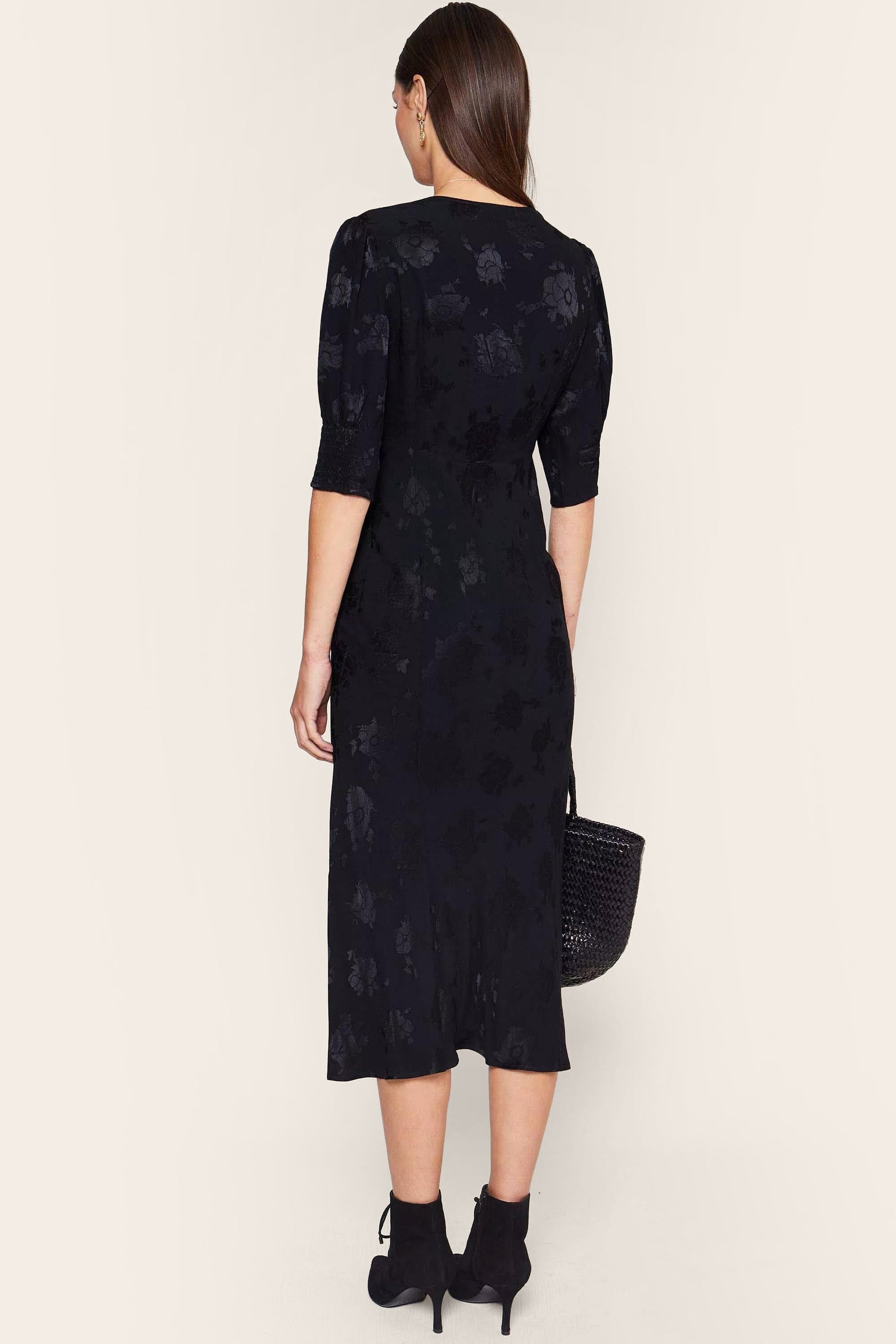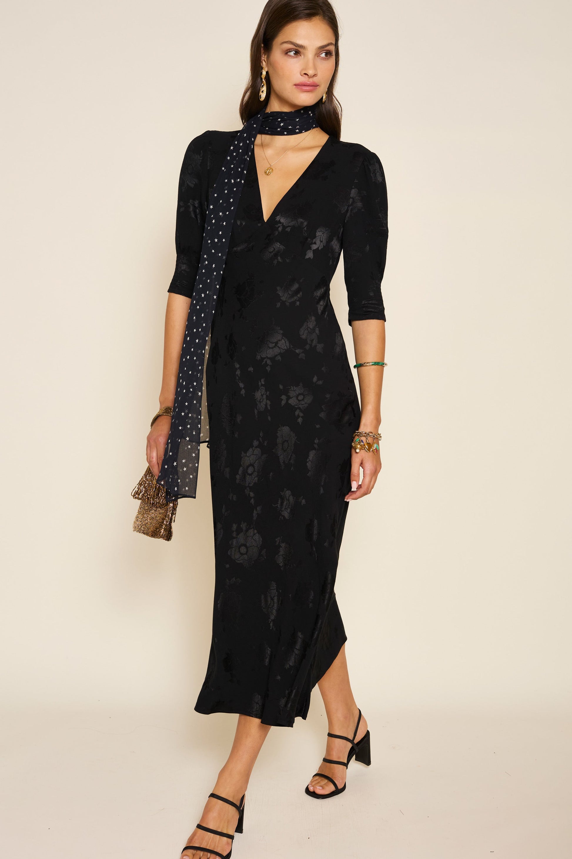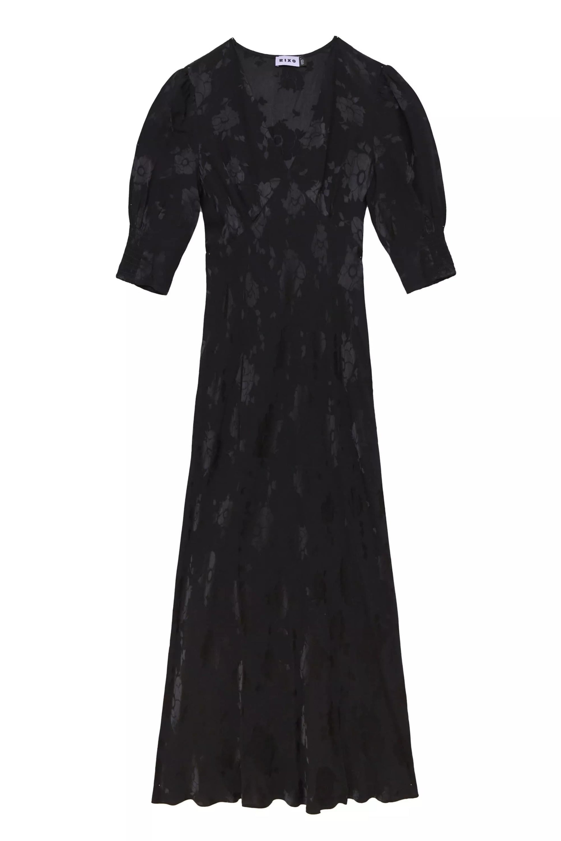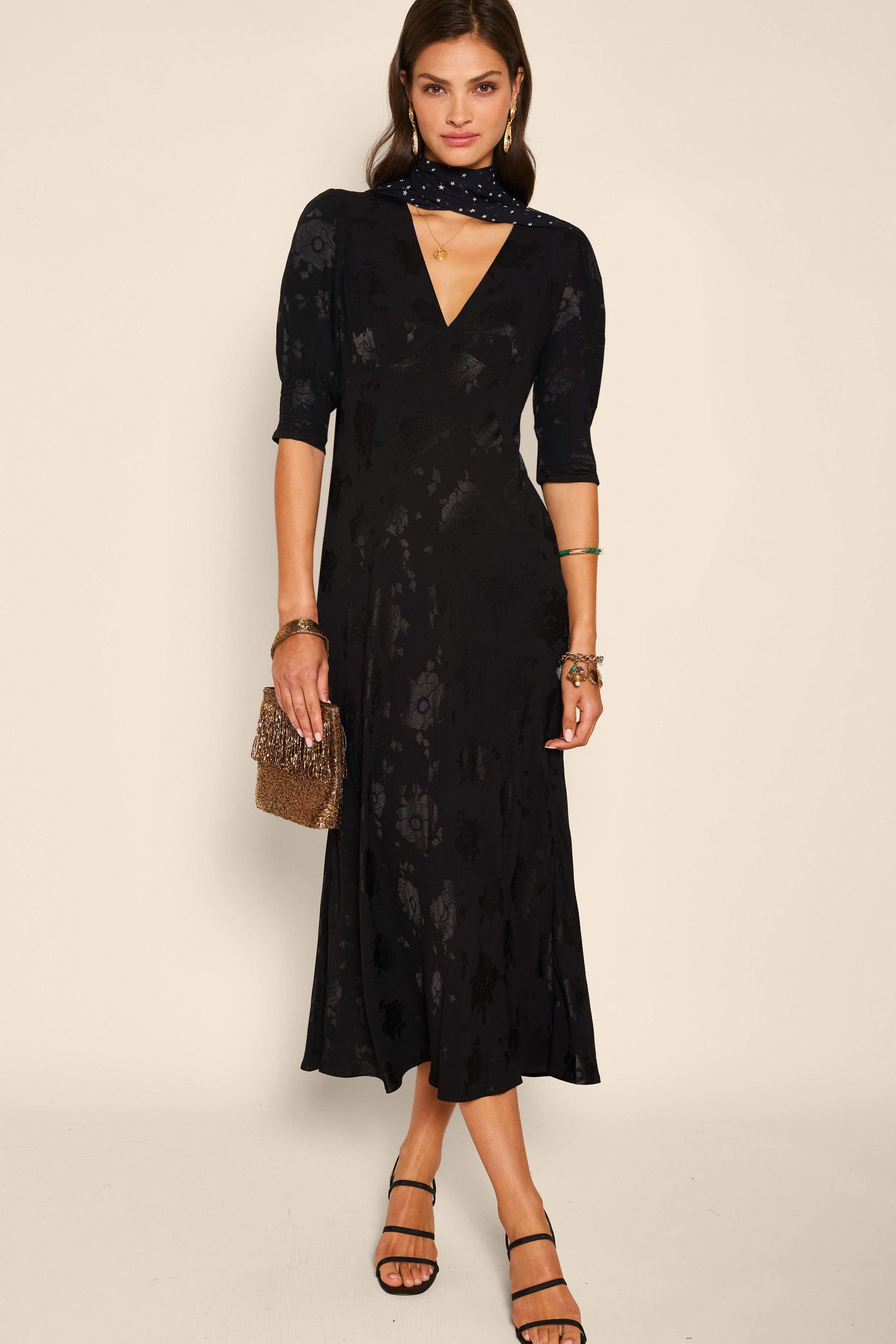 The Zadie is an iconic RIXO dress, and this poppy satin jacquard makes her the most desirable black midi you'll find.